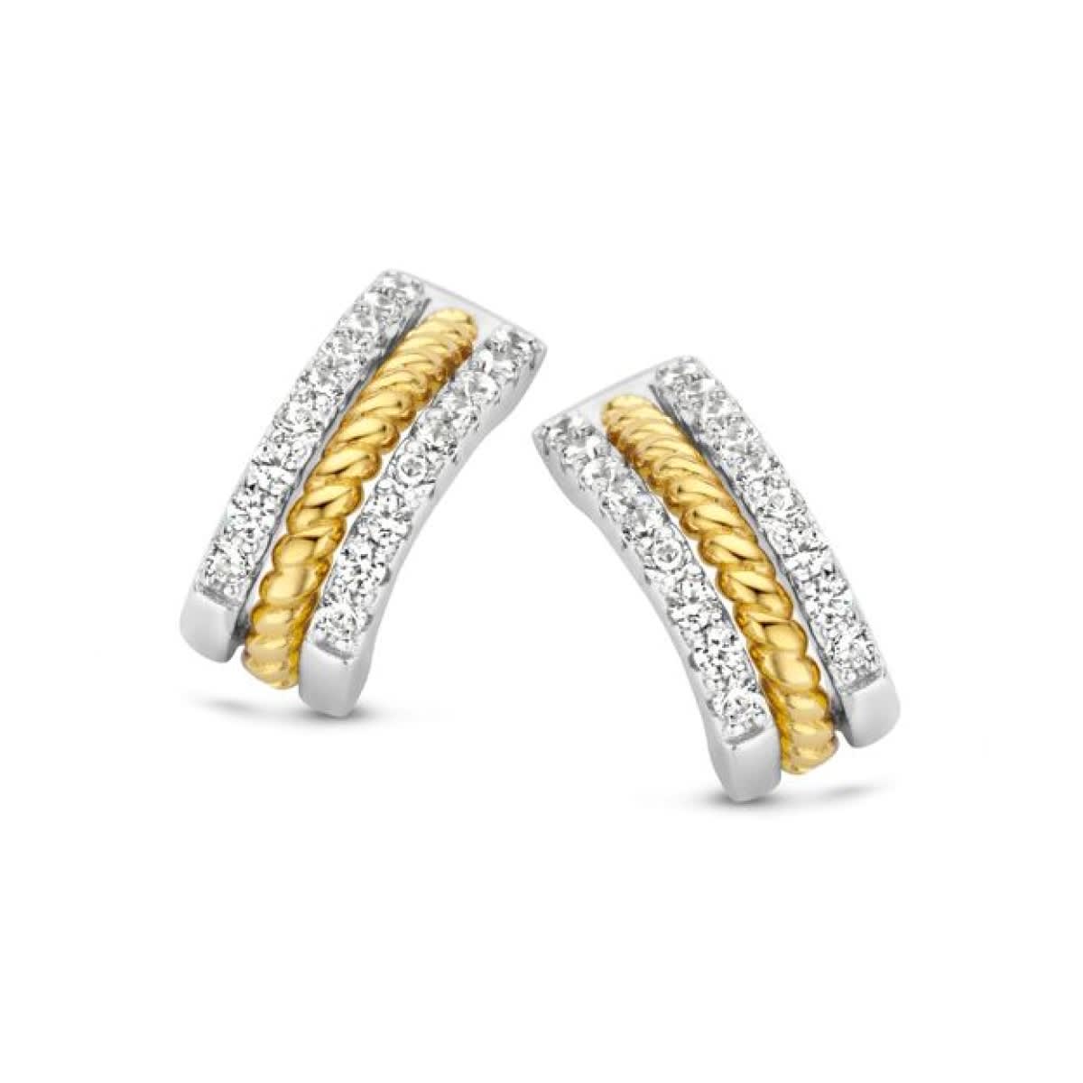 Les prix sont variables suivant le poids, la taille et le cours des matières premières.Boucles d’oreilles avec 2 barrettes d’oxydes de zirconium et une barrette tressée en argent doré.