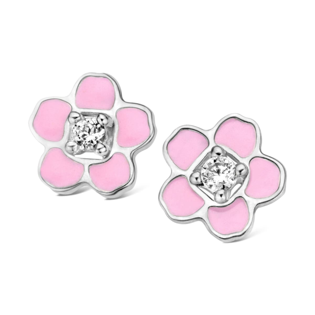 Les prix sont variables suivant le poids, la taille et le cours des matières premières.Boucles d’oreilles fleur en argent et laque rose, décorées d’oxydes de zirconium