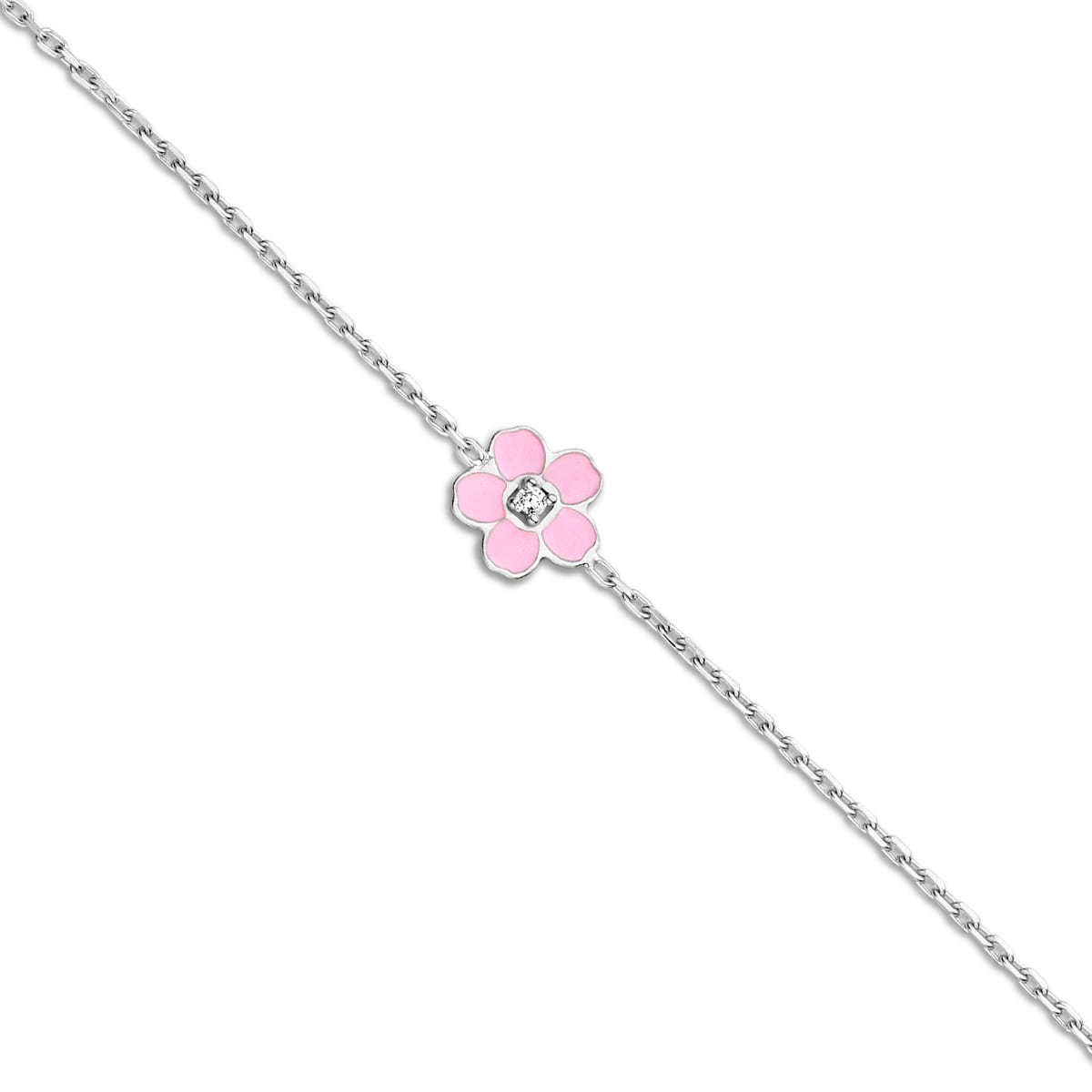 Les prix sont variables suivant le poids, la taille et le cours des matières premières.Bracelet fleur en argent et laque rose orné d’un oxyde de zirconium