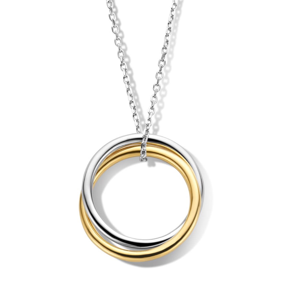 Les prix sont variables suivant le poids, la taille et le cours des matières premières.Collier Bicolore avec pendentif doubles anneaux entrelacés dont un en argent doré.