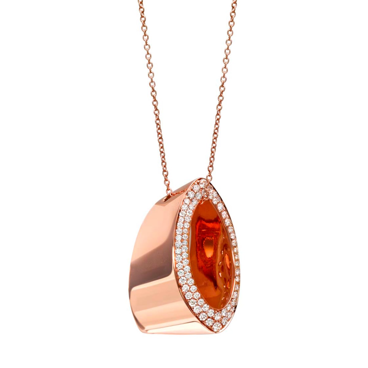 Ce collier contemporain en or rose met en valeur un double entourage de diamants blancs. Un collier de caractère pour une femme solaire...