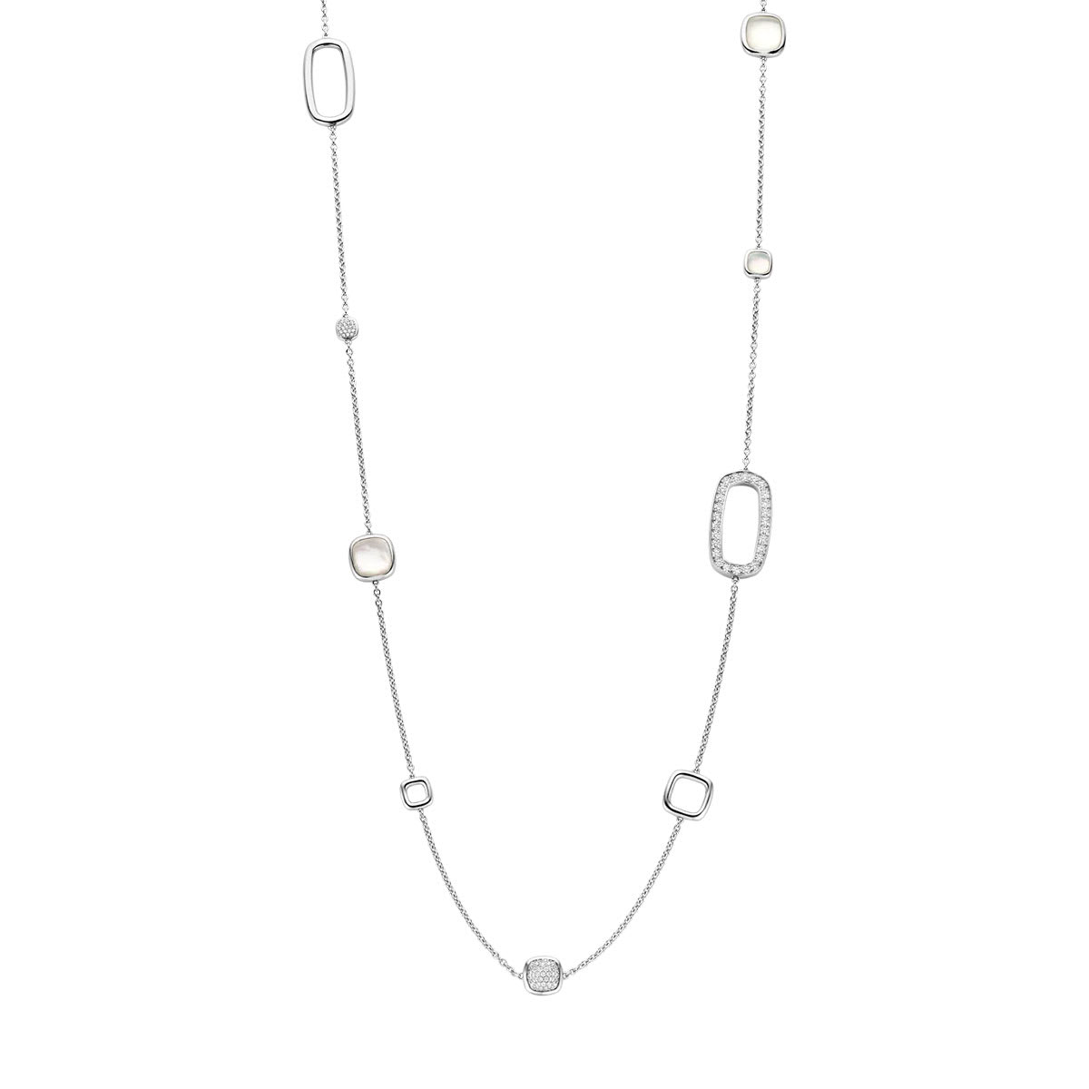 Ce collier délicat présente un jeu sophistiqué d'éléments rectangulaires et de forme coussin, ornés de zircones cubiques pavées et de touches de nacre lumineuses. Chaque détail est soigneusement placé le long de la chaîne, créant une esthétique à la fois moderne et intemporelle. Véritable déclaration d'élégance polyvalente, ce bijou sublimera sans effort toutes vos tenues estivales d'un éclat subtil et d'une touche contemporaine. Hypoallergénique et sans nickel, il est conçu pour offrir à la fois un confort luxueux et une beauté durable : le compagnon idéal en toute occasion.