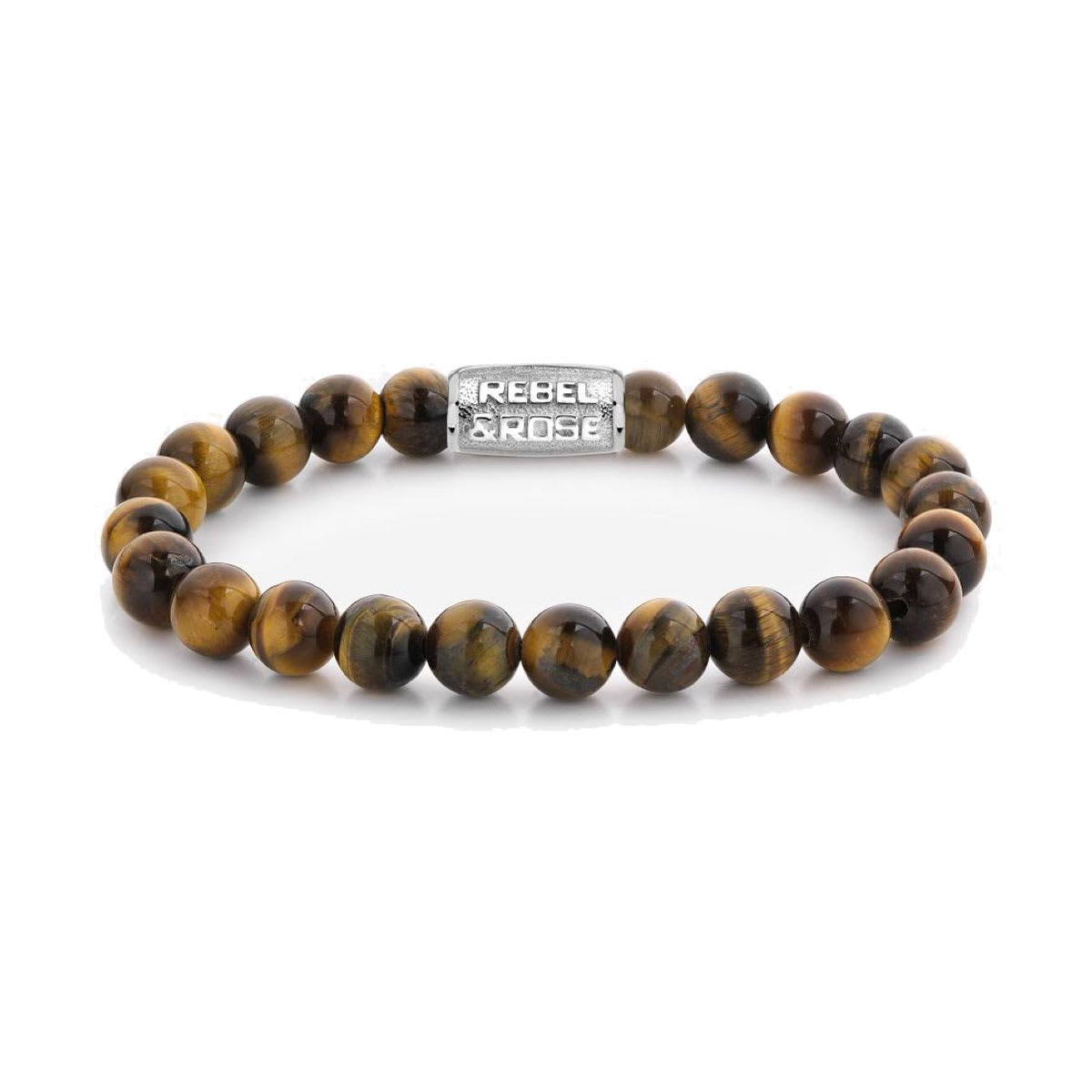 Bracelet REBEL & ROSE en perles d’œil de tigre, rhodonite et bronzite, de 6mm de diamètre, et son fermoir acier doré rose.