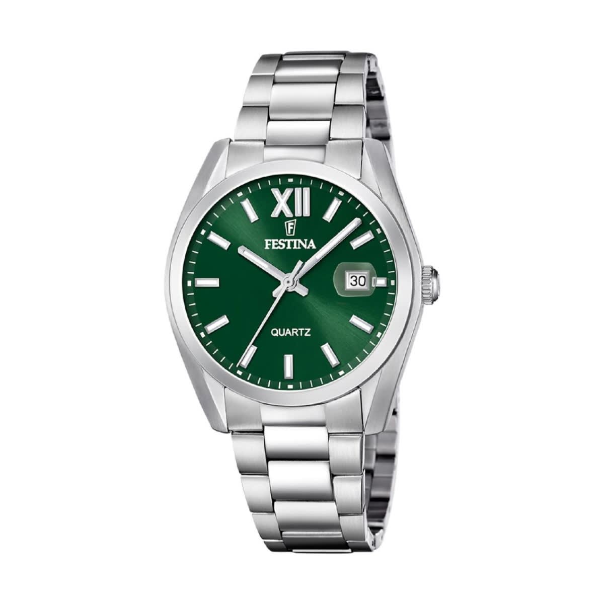 Prix de vente conseilléMontre Festina Classique en acier inoxydable, boitier acier et cadranvert foncé avec dateur.