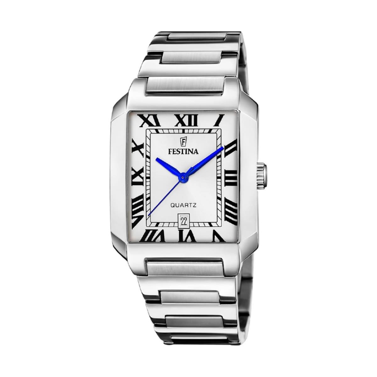 Prix de vente conseilléMontre Festina On the Square en acier inoxydable de forme rectangulaire, cadran blanc avec chiffres romains, les aiguilles bleus.