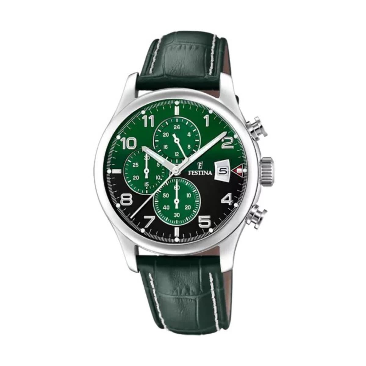 Prix de vente conseilléMontre Festina Timeless Chronograph en acier inoxydable, cadran avec un dégrade de vert, chiffres, date et le chronomètre.