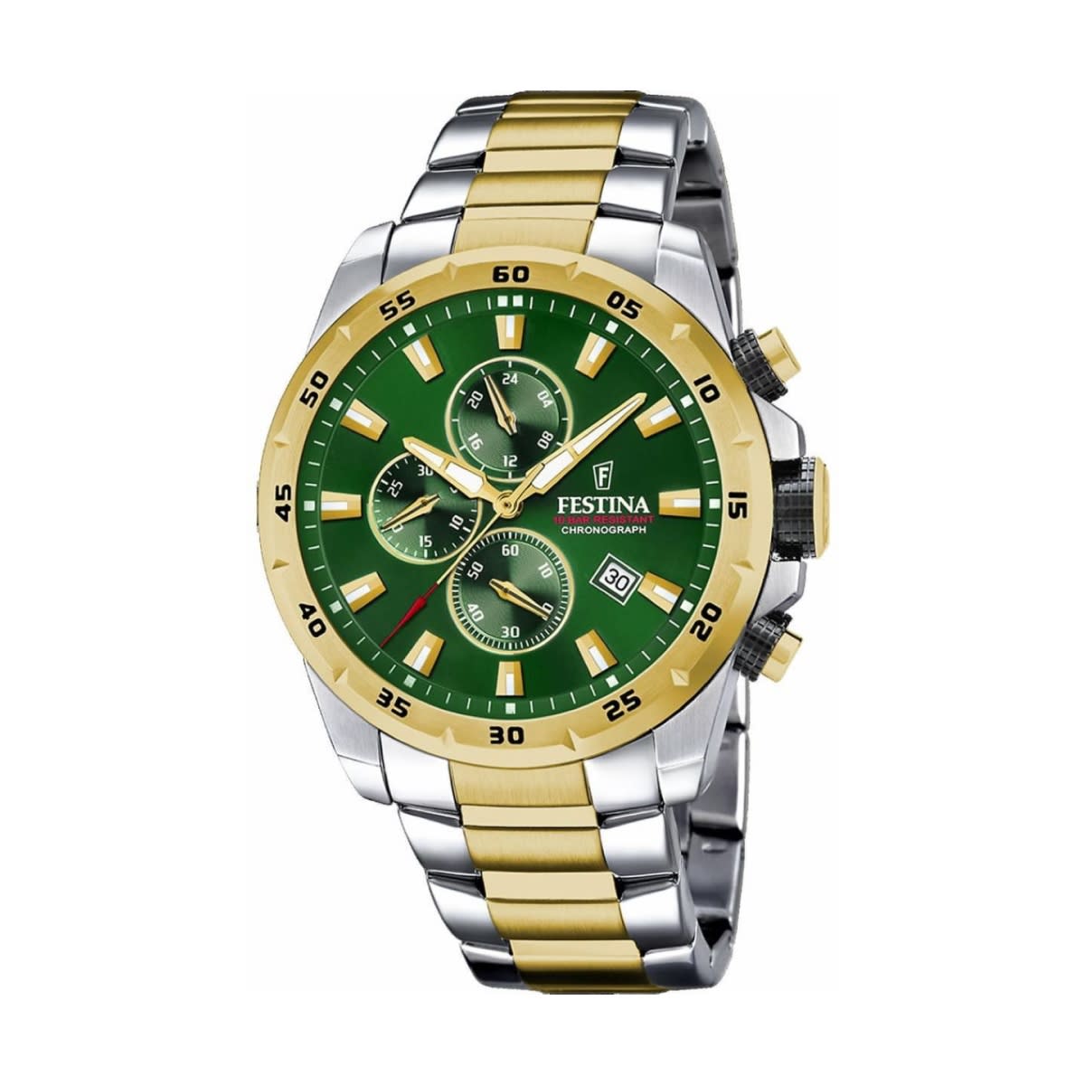 Prix de vente conseilléMontre Festina Timeless Chronograph en acier inoxydable et acier dore, cadran de couleur vert avec chronomètre, les aiguilles et index sont dorés.