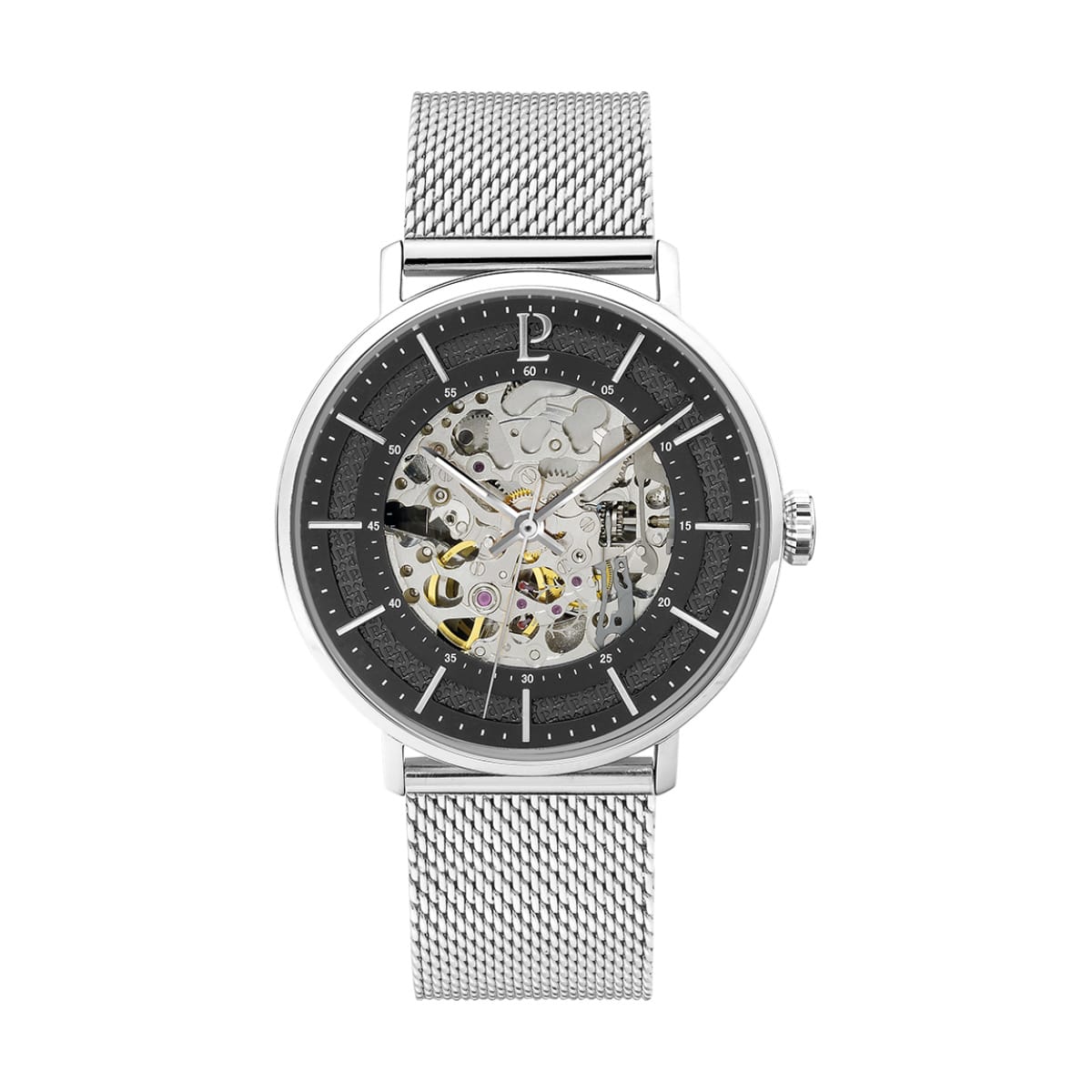 Montre Pierre Lannier Automatique Femme Espérance en acier doré-rose, cadran blanc cœur ouvert orné de motifs de trèfles, les index et aiguilles doré-rose.