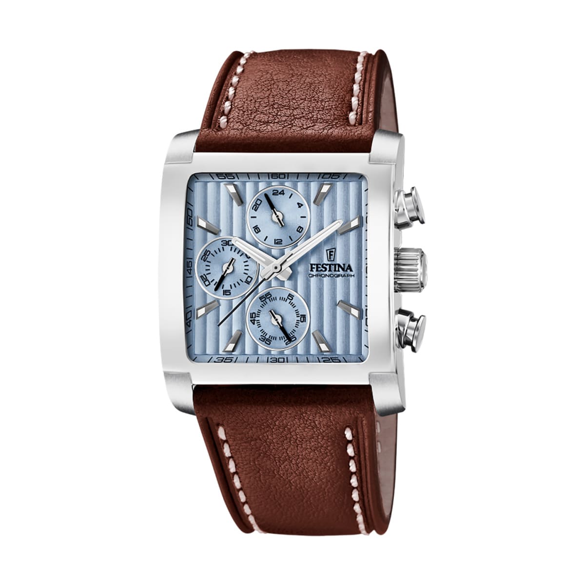 Montre Festina Timeless Chronograph en acier inoxydable, cadran de couleur noir avec chronomètre.