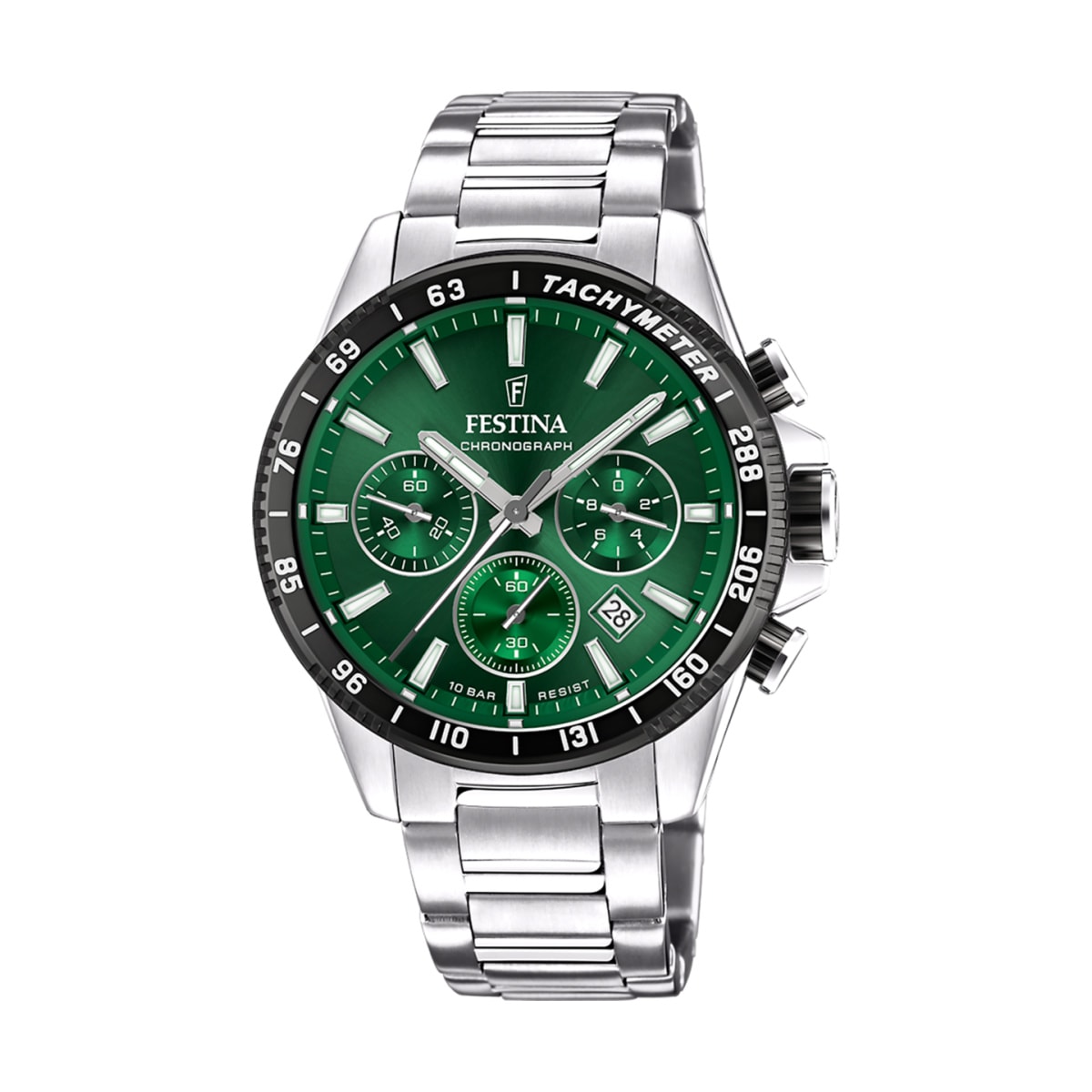 Montre Festina Timeless Chronograph en acier inoxydable, cadran de couleur noir avec chronomètre.