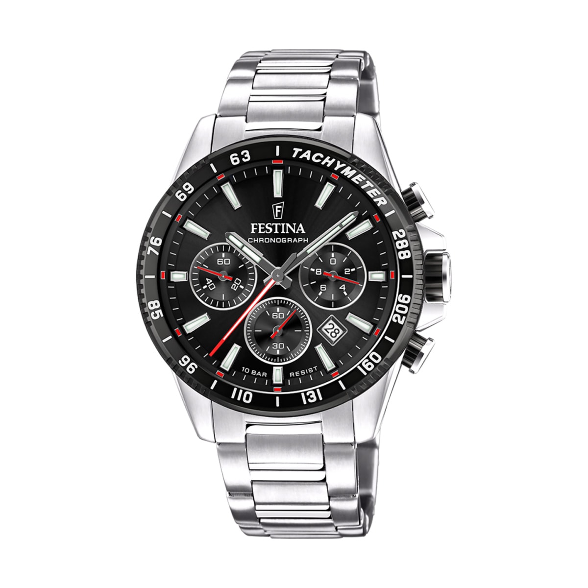 Montre Festina Timeless Chronograph en acier inoxydable, cadran de couleur gris avec chronomètre, dateur, les aiguilles et index sont fluorescents.