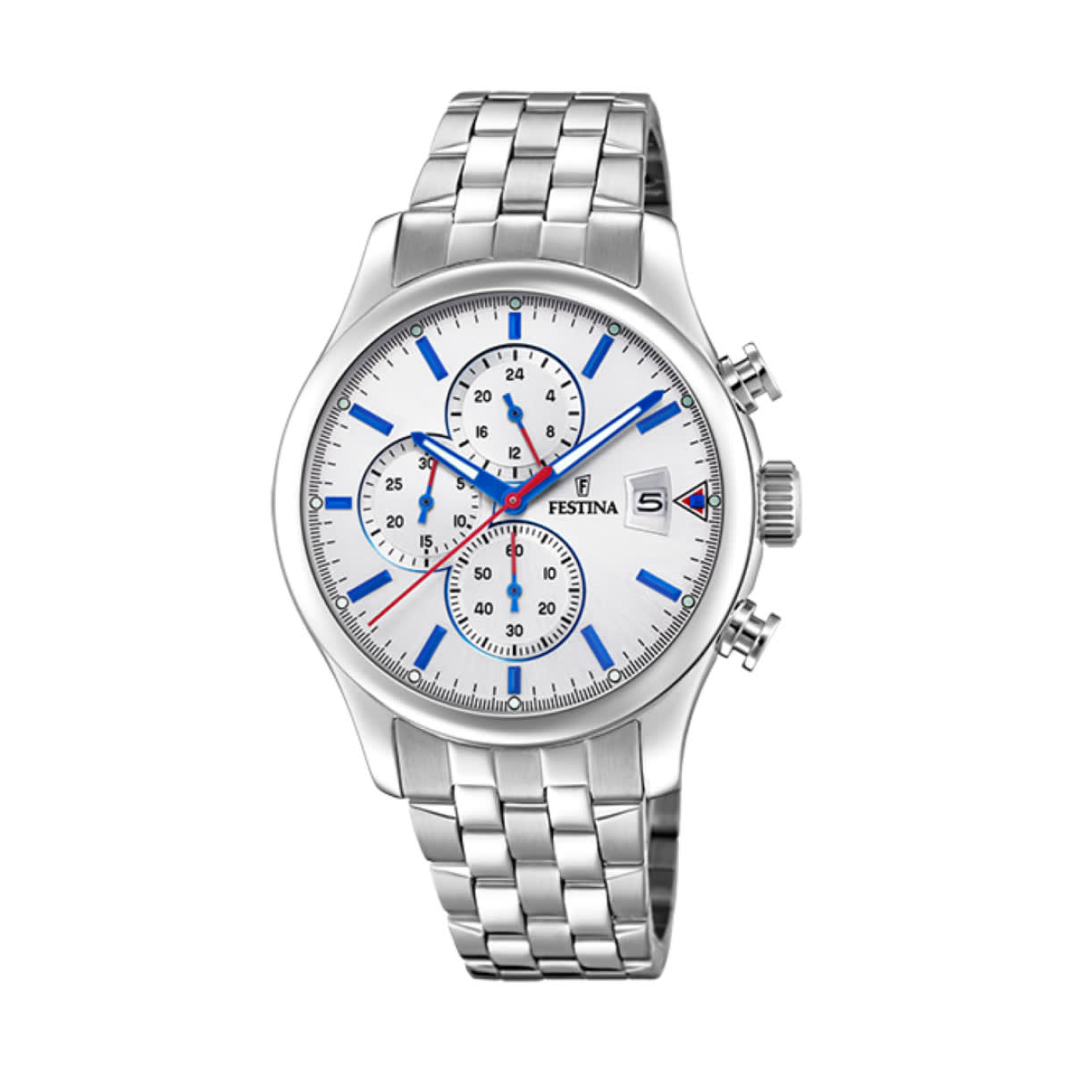 Montre Festina Classique en acier inoxydable, boitier acier et cadran bleu avec dateur.