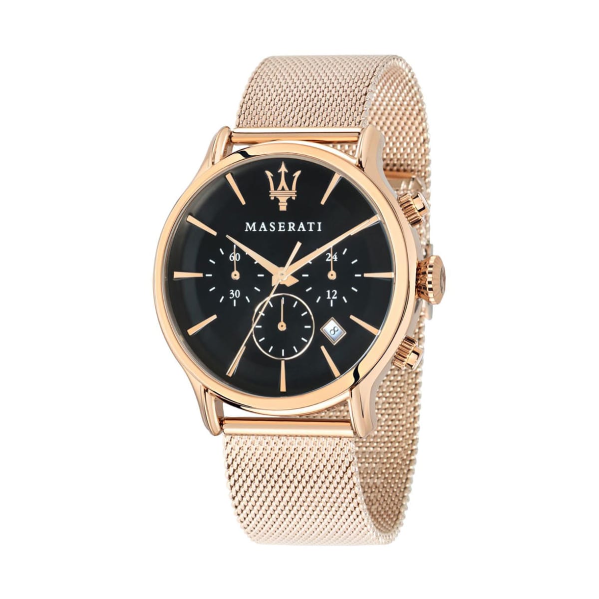 Prix de vente conseilléMontre MASERATI composée d’un boîtier rond de 45 mm, d’un fond noir et d’un bracelet en maille milanaise rosée dorée