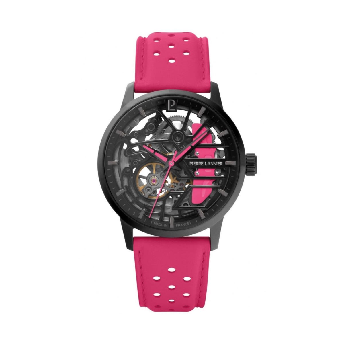Prix de vente conseilléMontre Pierre Lannier Automatique Femme Paddock est en acier noir, cadran squelette au mécanisme apparent avec un étrier de frein rose, les index noir et les aiguilles rose et noir.