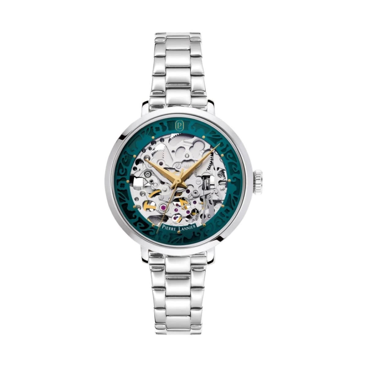 Prix de vente conseilléMontre Pierre Lannier Automatique Femme Squelette, cadran avec motif floral vert émeraude, les index et les aiguilles dorés.