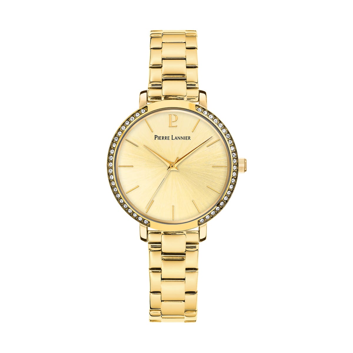 Montre Pierre Lannier Homme ESSENTIAL en acier doré, cadran noir, index et aiguilles dorés.