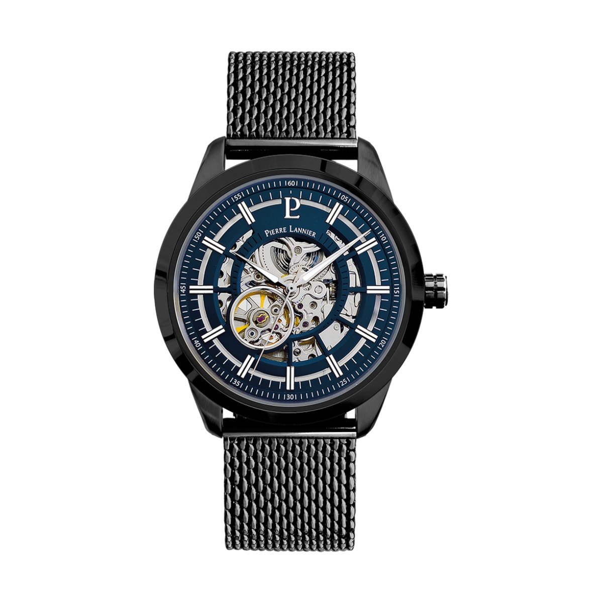 Son cadran squelette hypnotisant et ses détails travaillés et minutieux, en font une montre idéale pour les hommes amateurs de pièces horlogères d'exception. Les teintes froides lui confèrent beaucoup d'élégance, tout comme le bracelet en maille milanaise. La montre Homme 330D469 est dotée d'un boiter rond et noir, en acier poli inoxydable de 44 mm de large. Imposant et épais, il fait 13.70 mm d'épaisseur. A l'intérieur, les découpes du cadran sont bleu-foncé et font ressortir les rouages du mécanisme automatique. Le cadran squelette est rehaussé de cercles et également des teintes argentées des index et des aiguilles. D'un simple mouvement du poignet, vous remontez votre montre sans avoir à y penser. Le bracelet en maille milanaise noir fait 22 mm de large et s'ajuste facilement chez vous grâce à une boucle coulissante sécurisée. De plus, il est interchangeable : vous pouvez l'ôter pour le remplacer par un autre bracelet de 22 mm de notre gamme. Etanche à l'équivalent de 50 mètres (la pression de l'eau située à 50 mètres), la montre Homme Automatique 330D469 possède un verre minéral. Elle est garantie 2 ans et vous sera livrée dans un écrin Pierre Lannier.