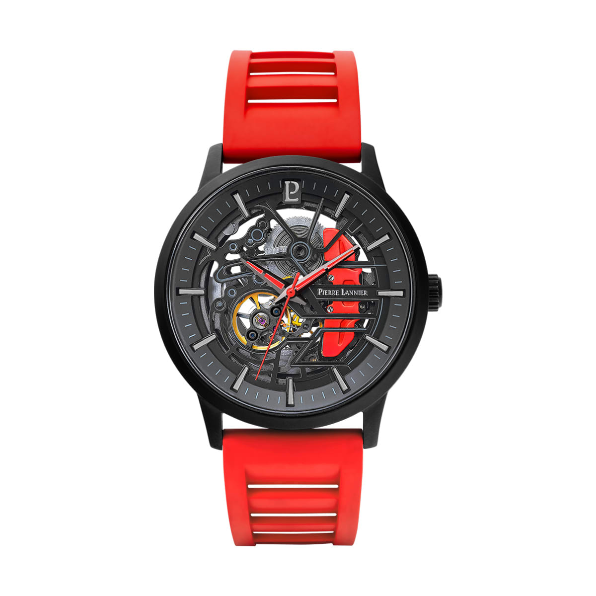 Montre Pierre Lannier Automatique Homme Squelette en acier, cadran bordeaux avec mouvement apparant , index et aiguilles argentés.